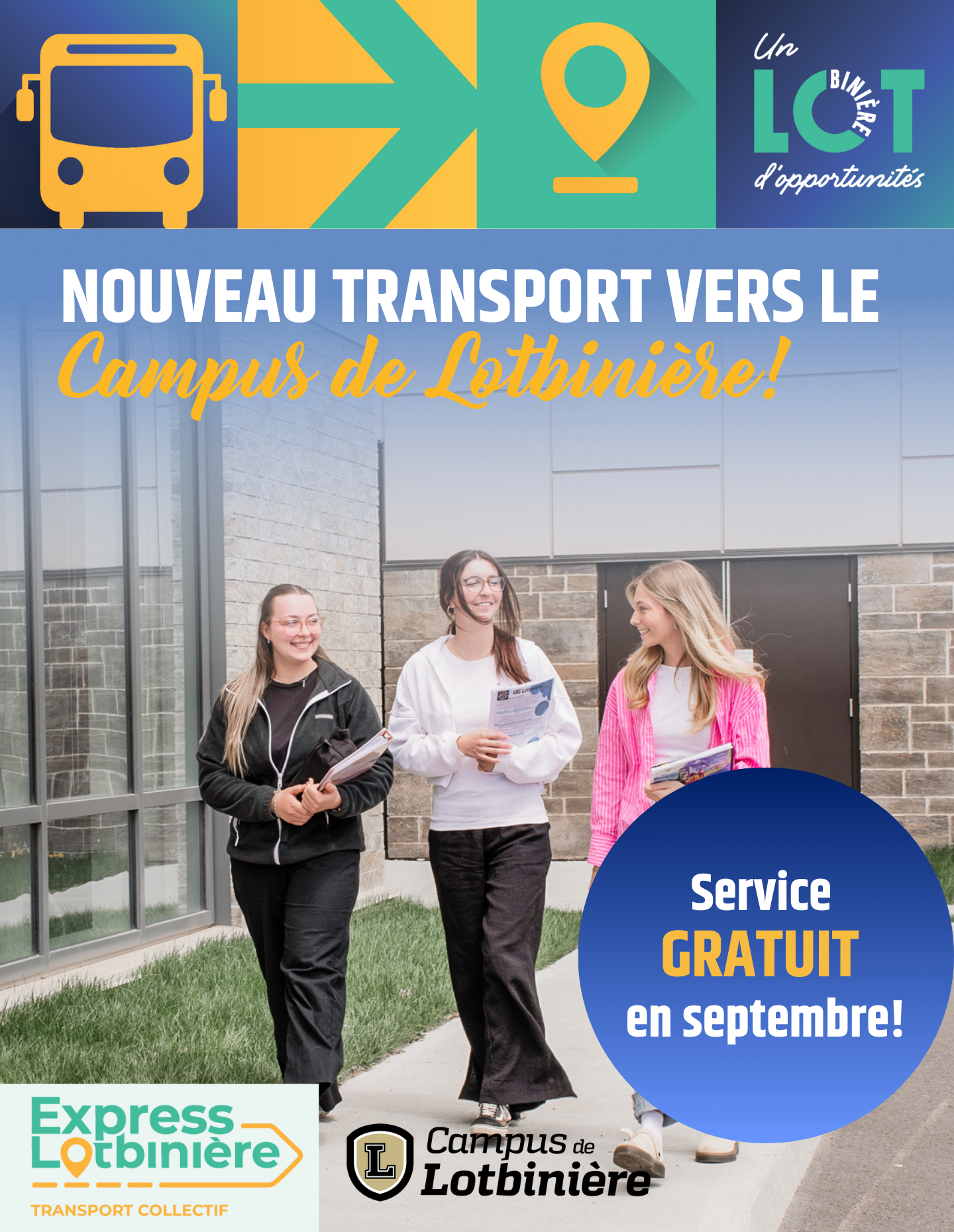 À compter de cet automne, notre Campus sera encore plus accessible grâce à un nouveau trajet de transport en commun offert par Express Lotbinière. Ce service reliera plusieurs municipalités de la MRC de Lotbinière. De plus, le transport sera gratuit pour tout le mois de...
