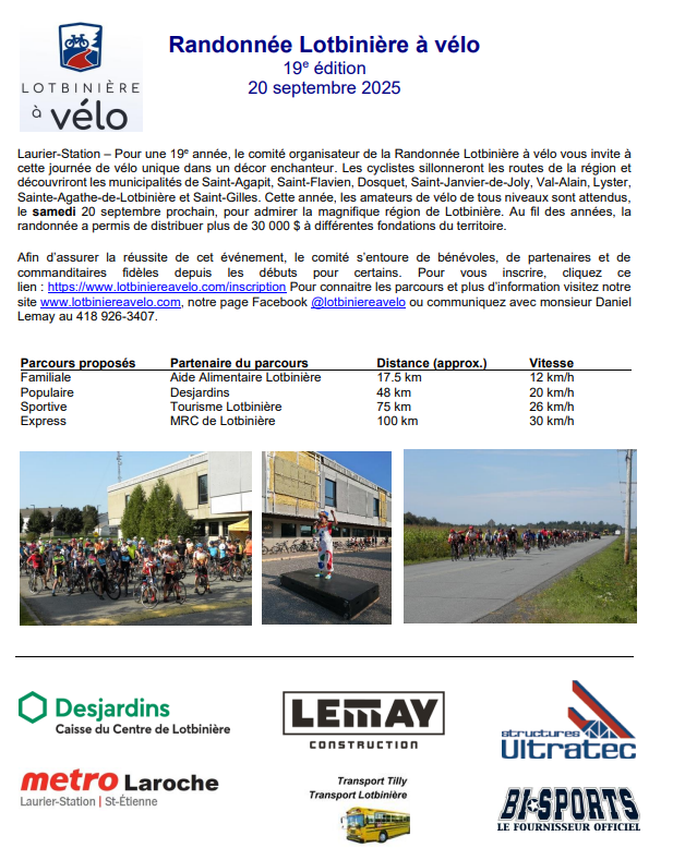 Une expérience unique dans la Région de Lotbinière Faites comme tous les cyclistes de la l'année dernière et sillonnez les routes de Lotbinière à vélo! Un paysage magnifique et des gens de coeur. Inscriptions: https://www.lotbiniereavelo.com/inscription ...