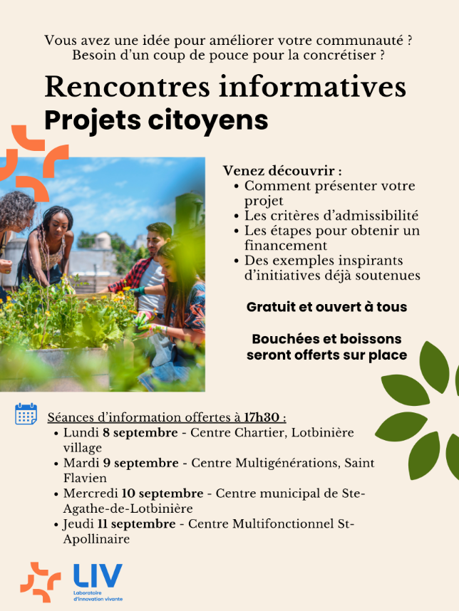 Séances d’information offertes à 17h30 : Lundi 8 septembre - Centre Chartier, 440 Rte Marie-Victorin Mardi 9 septembre - Salle de réception du Centre Multigénérations – 12B rue Roberge Mercredi 10 septembre - Centre municipal de Ste-Agathe-de-Lotbinière (Salle du conseil) - 2602 Rue Saint-Pierre Jeudi 11 septembre - Centre...
