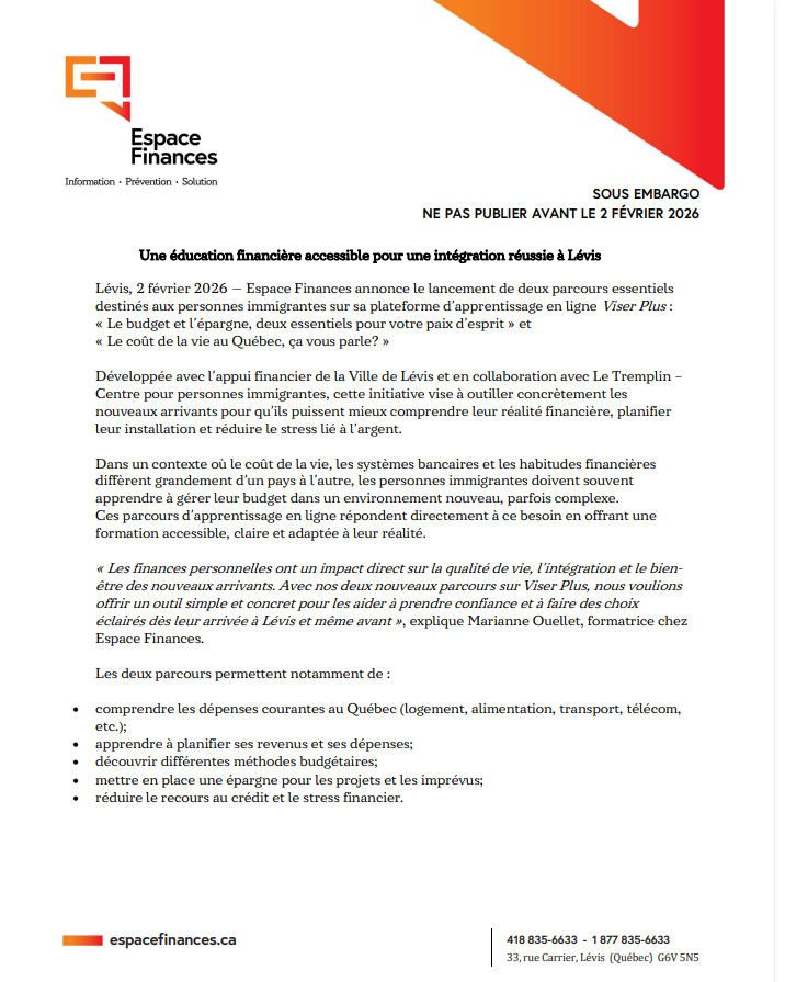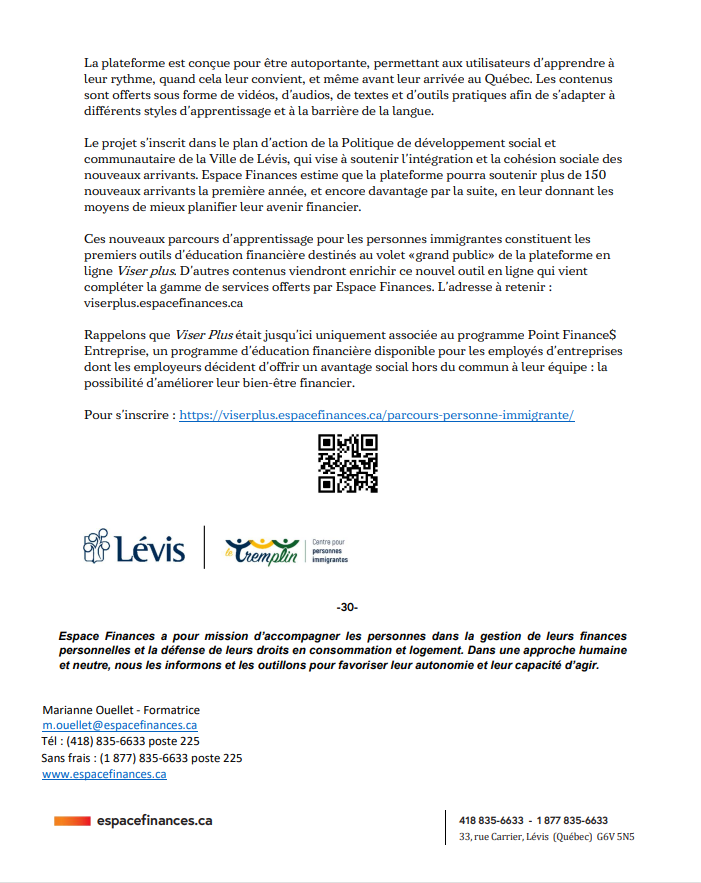 02 Fév COMMUNIQUÉ DE PRESSE ESPACES FINANCES💲 Publié à 09:20h Dans Non classé par Municipalité d'Issoudun 0 Commentaires 0 J'aime Partager Lancement d’une plateforme d’apprentissage d’éducation financière en ligne sans frais pour les personnes immigrantes.