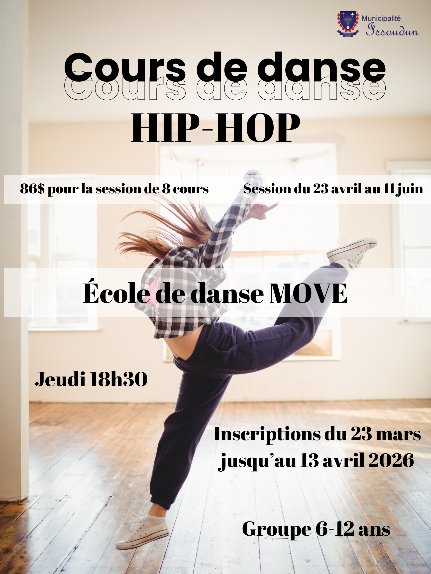 Il ne vous reste que cette fin de semaine pour inscrire vos enfants aux cours de danse Hip-Hop! Ne manquez pas votre chance, car sans le nombre minimum requis de 8 inscriptions les cours ne pourront avoir lieu.