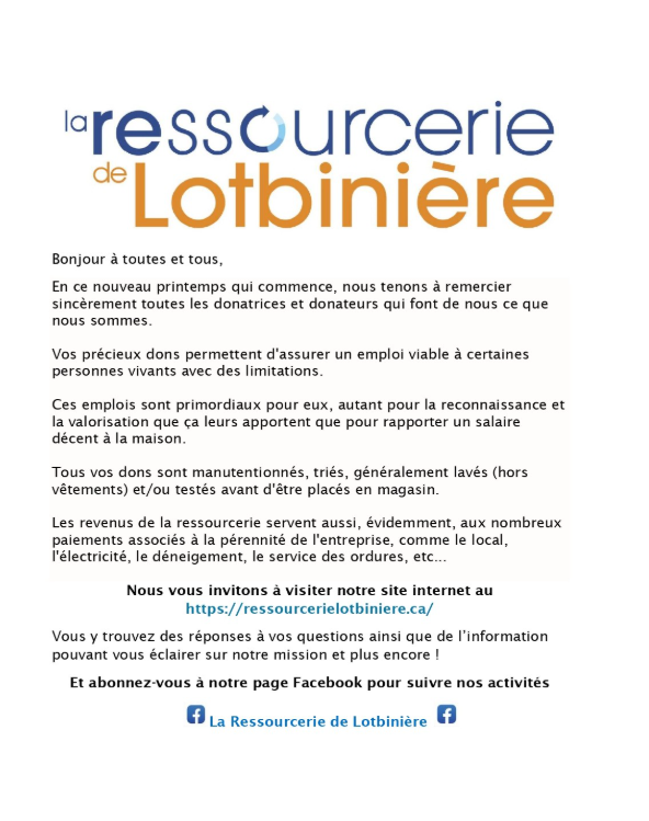 09 Avr RESSOURCERIE DE LOTBINIÈRE Publié à 08:35h Dans Non classé par Municipalité d'Issoudun 0 Commentaires 0 J'aime Partager